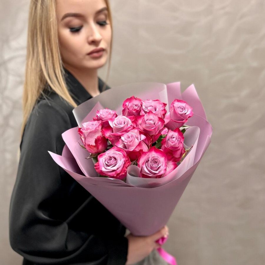 На фото букет из 11 фиолетовых роз. В составе: роза 11 шт, дизайнерская упаковка 1 шт, атласная лента 1 шт, . Все цветы свежие и ароматные, букет красиво оформлен и отлично подходит для подарка. Доступна доставка цветов или самовывоз.