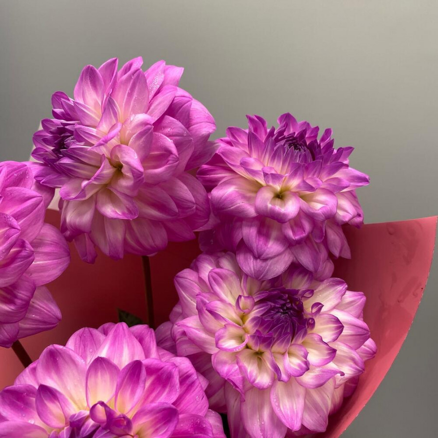 На фото букет из 5 розово-сиреневых георгин. В составе: георгина 5 шт, дизайнерская упаковка 1 шт, атласная лента 2 шт, . Все цветы свежие и ароматные, букет красиво оформлен и отлично подходит для подарка. Доступна доставка цветов или самовывоз.